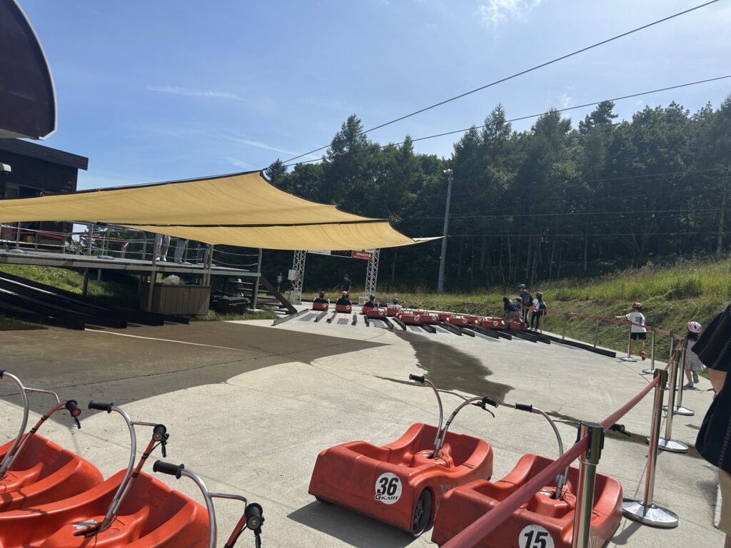 まずはリフトに乗って山の上まで登ります。リフト自体の待ち時間は10分程度でしたが、リフトが次々来るのでそれほど長く感じません。リフトに揺られて約5分、到着すると目の前がゴーカートの乗り場です。